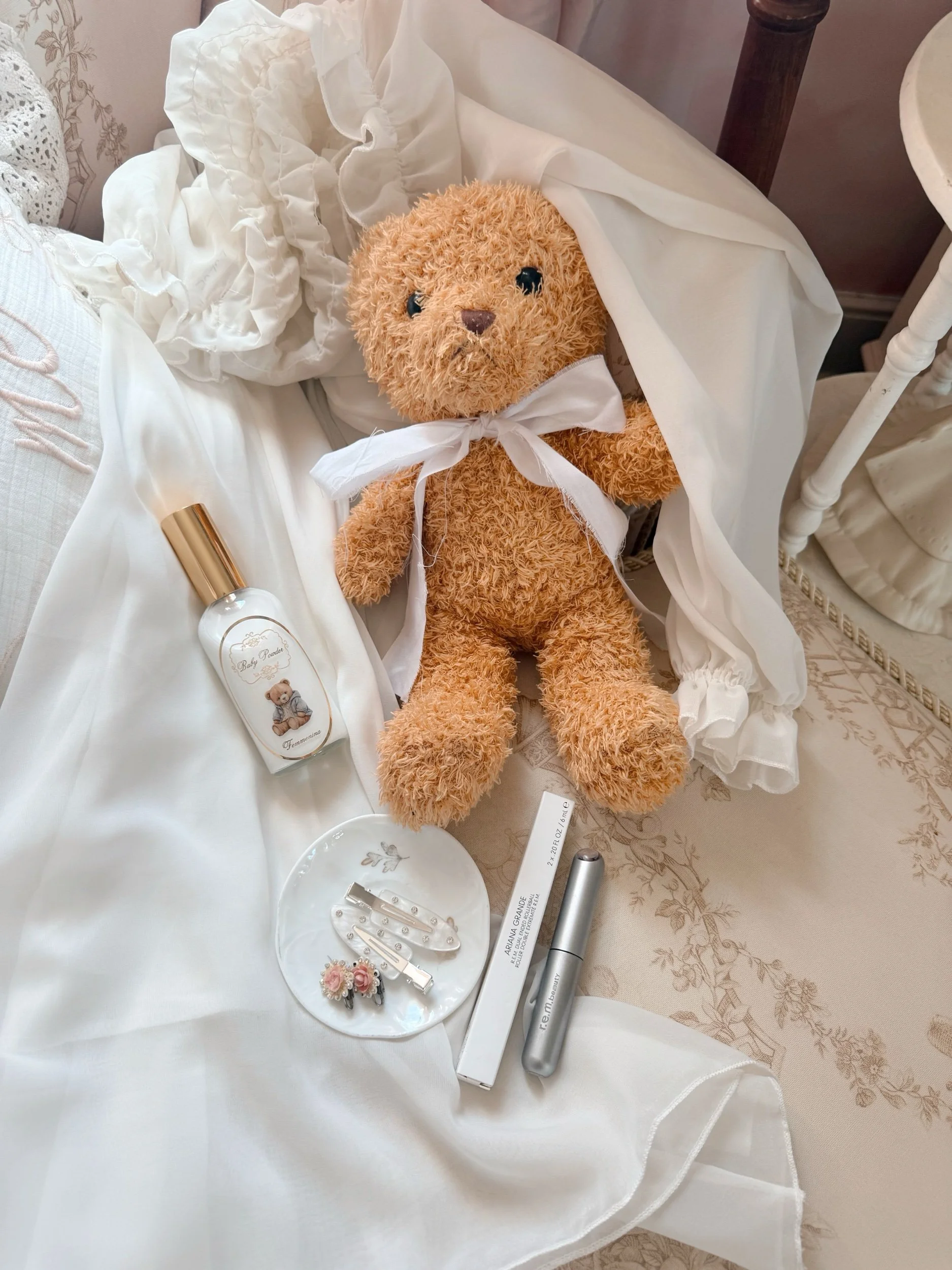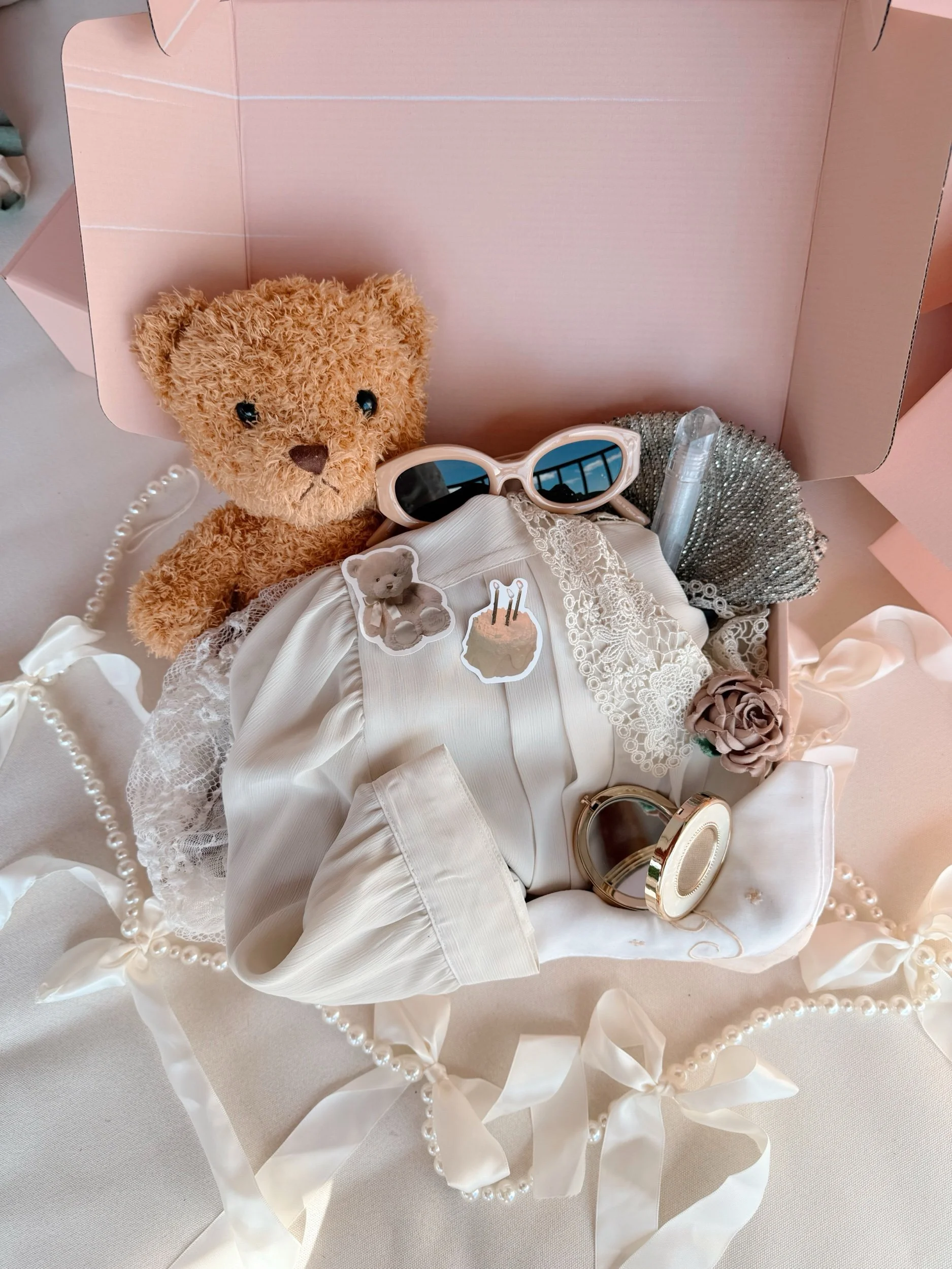 Carefully curated for the devoted fan, and inspired by melancholic memories of the past, this comforting cream-colored box delivers vintage influences drawn from the award-winning film "Brighter Days" by Ariana, complemented by aesthetics from her current tour and album. Debuting with a staple teddy bear, the starter kit blends theatrical vintage with modern pieces and meticulous details to elevate your look for her tour—whether you’re watching from home or attending in 2026. With bows, bears, and beauty, the box promises a cozy, coquette vibe. Containing 7–10 thoughtfully selected items, it is crafted for the discerning girl who values growth, comfort, and elegance.